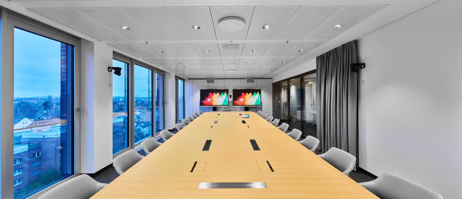 Sala de juntas ejecutiva de la Cámara de Comercio de Hannover con dos pantallas y micrófono de techo TCC M de Sennheiser, destacando la integración tecnológica para eventos corporativos híbridos.