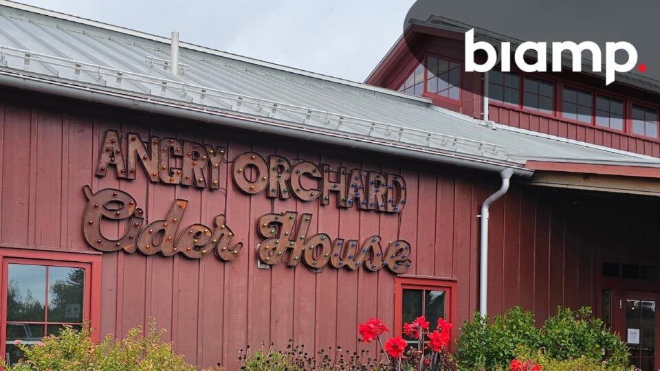 La Angry Orchard Walden Cider House, en Walden, Nueva York, es uno de esos espacios donde el ambiente no depende de un único factor. La arquitectura, la circulación del público, la actividad del día y la identidad de la marca conviven en una misma experiencia. En este caso, el sonido también tenía que estar a la altura. Para conseguirlo, Boston Beer Company apostó por un sistema de audio por zonas Biamp capaz de ofrecer control, consistencia y fiabilidad en un recinto con necesidades muy distintas entre sí.